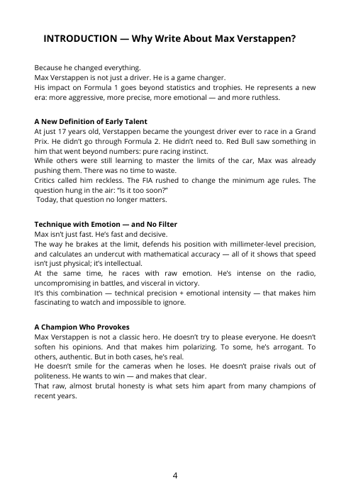 This exclusive digital book offers a deep dive into the life and career of one of the most dominant drivers of the modern era. Structured chapter by chapter, season by season, it traces Max’s evolution from a bold young rookie to a multi-time world champion.